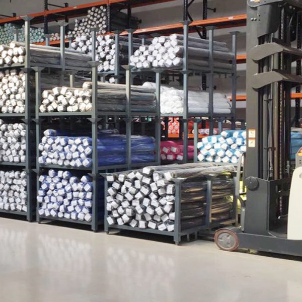 This textile stackable rack is a great way to increase your warehouse space for fabric, carpet, carpet padding, or other textile roll products. It can be loaded directly on the stack rack from the assembly line, and then stored in your warehouse or staging area. These racks will reduce your labor costs and eliminate damages while making storage and receiving a breeze. Since these racks are portable, they can be loaded directly onto a truck for delivery without having to remove the product from the rack.